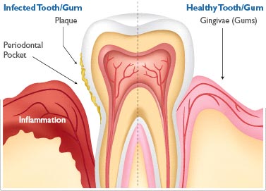 When a patient is suffering from periodontal disease, there are greater counts of Porphyromonas Gingivalis and the damage to the gums caused by the disease means bacteria has access to the blood stream through the deep pockets/damaged gum lining.